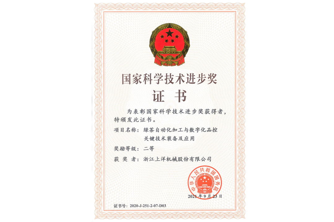 2021年11月3日,公司與安徽農(nóng)業(yè)大學(xué)等單位聯(lián)合申報(bào)的《綠茶自動(dòng)化加工與數(shù)字化品控關(guān)鍵技術(shù)裝備及應(yīng)用》獲得國(guó)家科學(xué)技術(shù)進(jìn)步獎(jiǎng)二等獎(jiǎng)。公司按照“品控?cái)?shù)字化-加工自動(dòng)化-技術(shù)體系化”思路,歷經(jīng)14年攻關(guān)和應(yīng)用,獲獎(jiǎng)項(xiàng)目技術(shù)及裝備推廣至我國(guó)所有產(chǎn)茶省(市、區(qū))的 1200 多家茶葉企業(yè)。